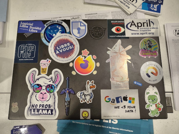Cet ordi appartient à Amélie, membre de l’April rencontrée lors du Capitole du Libre 2025. Elle a eu la gentillesse de tenir le stand de l’April pendant deux jours!! Nos journalistes l’ont beaucoup appréciée et lui ont offert le dernier sticker Lama déchaîné pour agrémenter son ordinateur. Voici une photo!